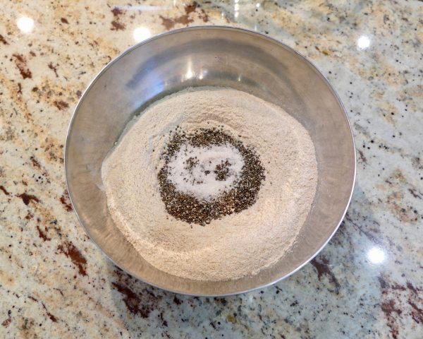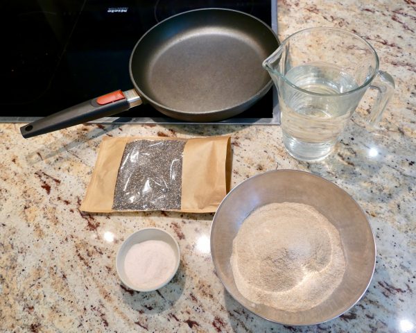 Polohrubú múku zmiešame so soľou a chia semiačkami. Malé množstvo chia semiačok zabezpečí vláčnosť placiek. Ostanú mäkké a neoschnú.