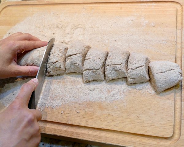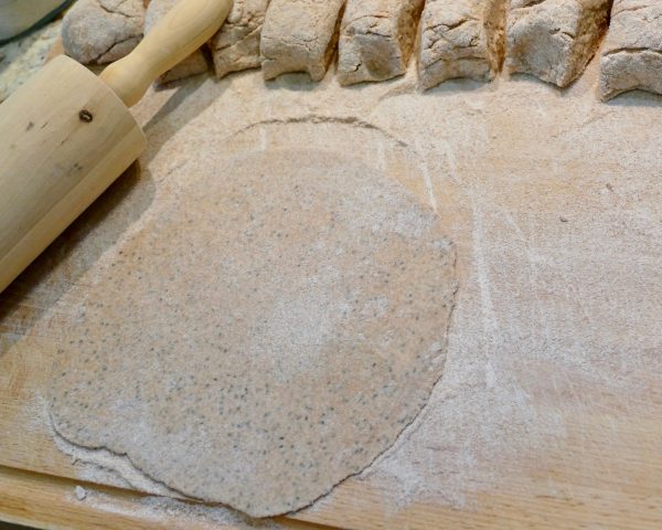 Cesto rozdelíme na niekoľko rovnakých častí a vytvarujeme guľôčky veľkosti ping-pongovej loptičky, obalíme v múke a vyvaľkáme placky. Je lepšie placky pár krát preložiť a znovu vyvaľkať.